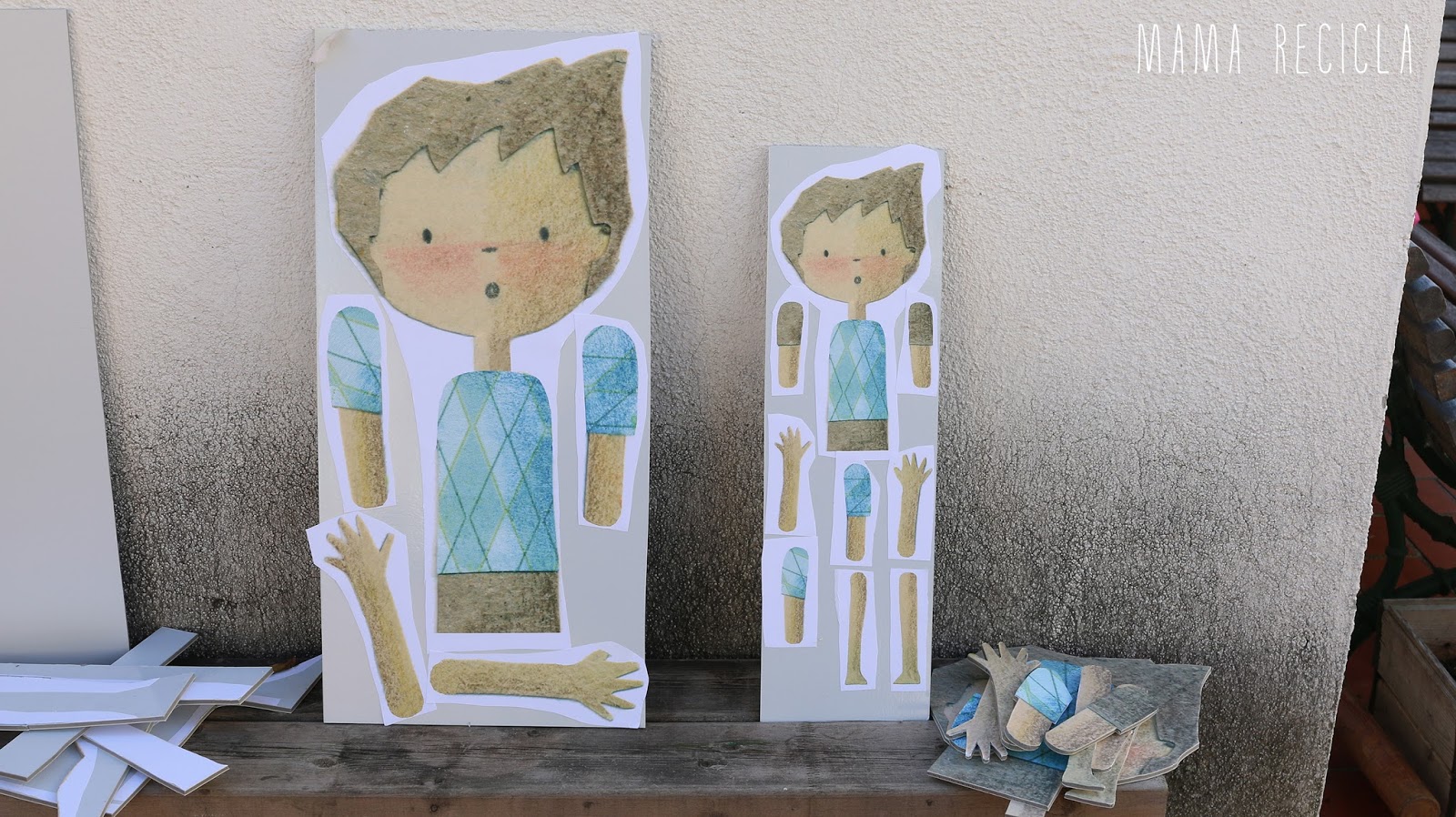 Queria transformar o protagonista do meu livro RESPIRA num boneco articulado que pudesse levar para as apresentações. Apenas foi necessário desenhá-lo de novo com as partes separadas, imprimi-lo em grande formato, colá-lo a uma prancha de cartão pluma (adesiva), cortar tudo e colocar ataches que permitissem rodar as diferentes partes. Fizemos dois bonecos de formato diferente (para aproveitar a impressão) e tivemos de repetir umas partes para que funcionasse melhor (descobrimos que a cabeça unida ao tronco permitia subir os braços por trás). Até experimentámos animá-lo com um stop motion muito curto. Os miúdos estão encantados que este boneco tenha ganhado vida e eu tenho de vigiar para que chegue à apresentação!